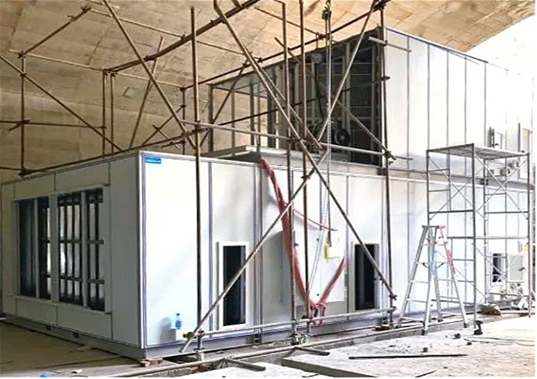 The modular air conditioning unit with large air volume from Shenling used in this project has a maximum air treatment capacity of 150,000 m3/h of a single unit, with its upper and lower parts stacked for installation. The integrated evaporative cooling chiller is placed outside the 988m platform to provide chilled water for the modular air-conditioning unit with large air volume, which has met the need for the centralized cooling of the hydropower station.